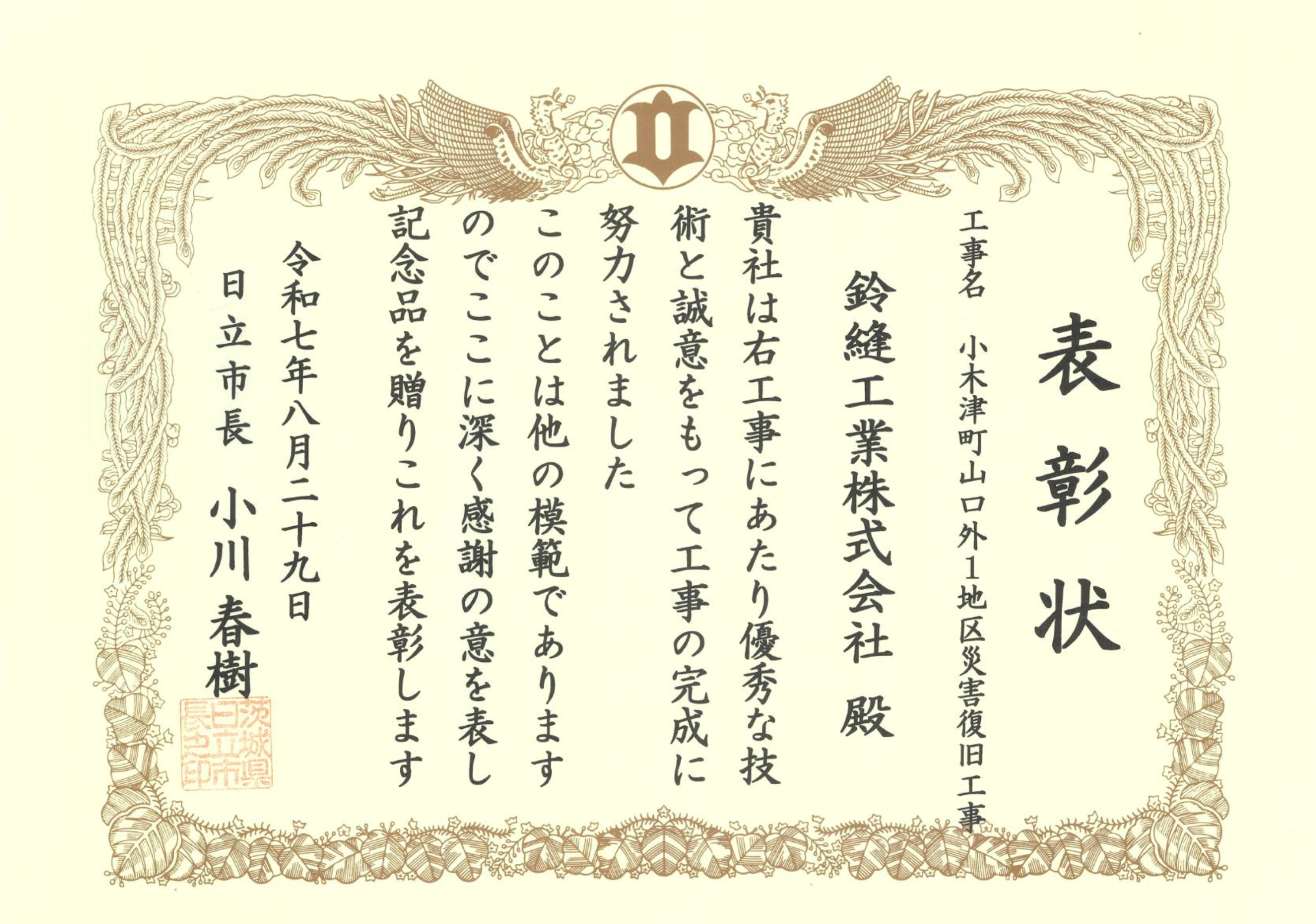 この度、令和5年度日立市建設業者表彰式が開催され、4件の工事が表彰されました。